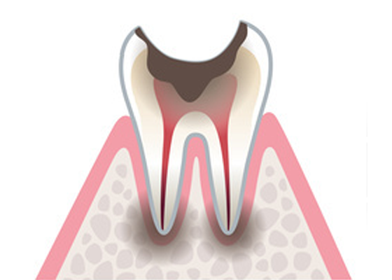 神経が死んでしまった歯は痛みを感じなくなりますが、進行はそこで終わらずに神経(歯の根)の先に細菌や膿を徐々に溜めていき、硬いものを噛むと違和感や痛みが生じるようになります。
