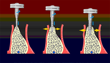 あごの骨をたくさん削って穴をつくるのとは異なり、オステオプッシャーは、骨を削らずに、骨を押し拡げてインプラントを埋入します。